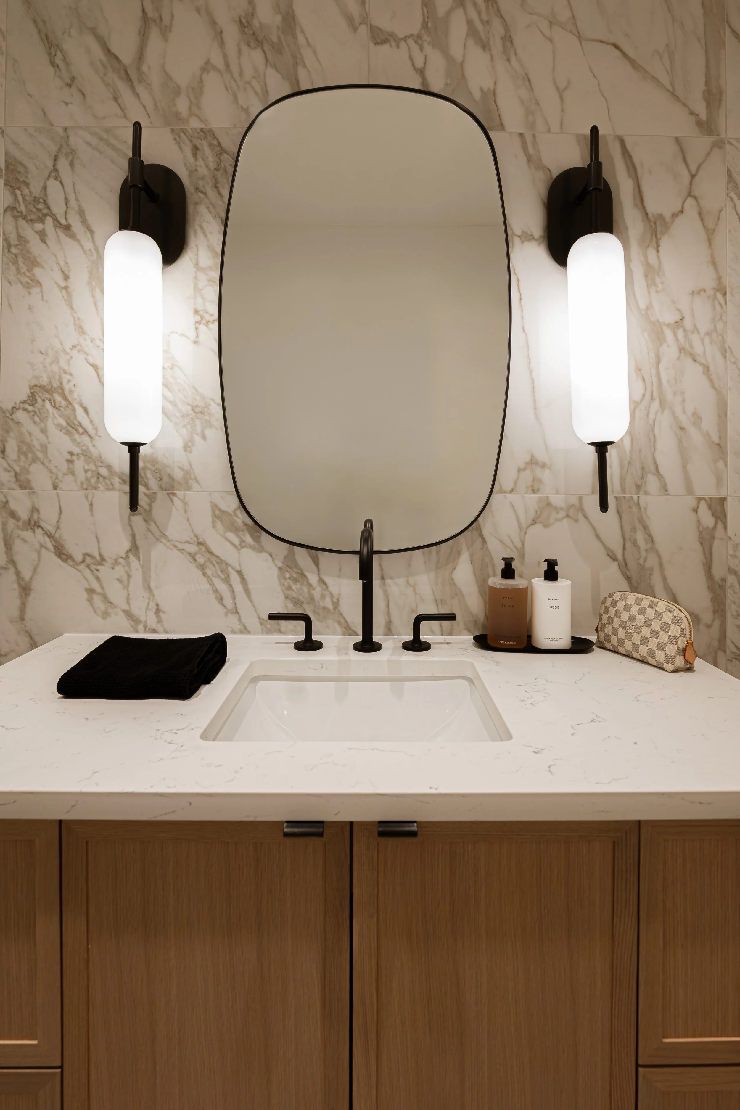 The infusion of marble veins across various features introduces a timeless and sophisticated allure, complemented by the sleek aesthetic of matte black finishes.