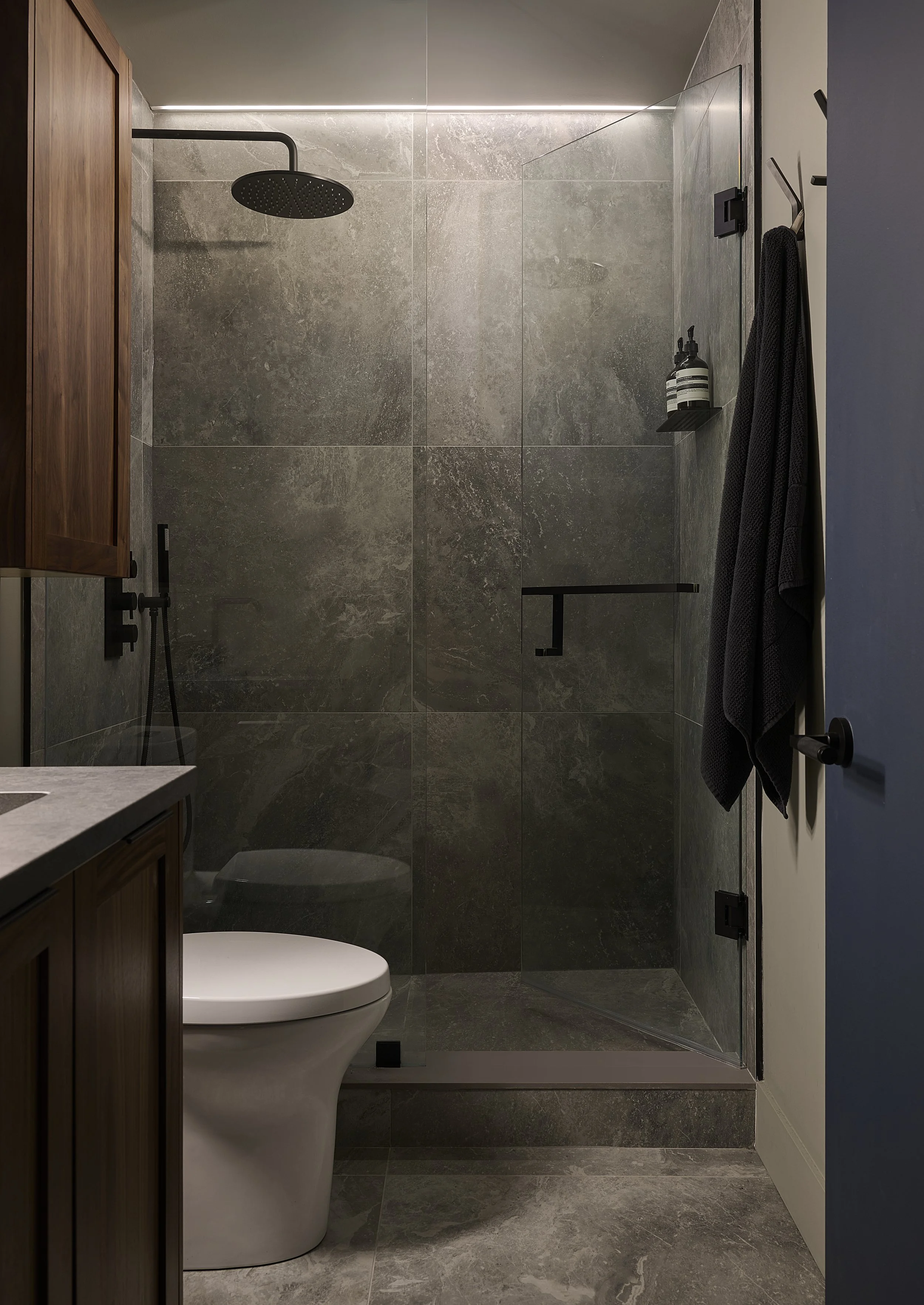 This project achieves a refined balance of sophistication and warmth by juxtaposing deep navy tones with the rich, natural elegance of walnut millwork. Thoughtfully designed to maximize functionality, the space incorporates discreet, built-in storage solutions that maintain a seamless and uncluttered aesthetic.
